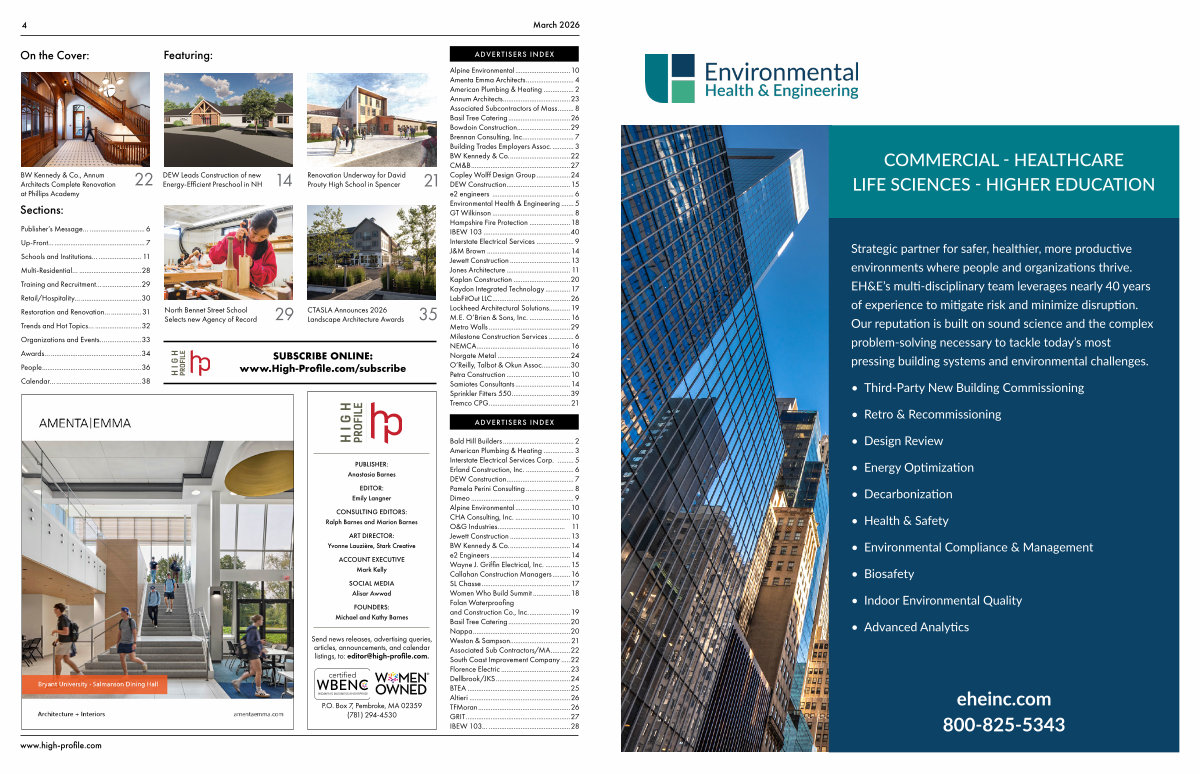 Alpine Environmental................................ 10 Amenta Emma Architects............................ 4 American Plumbing & Heating.................. 2 Annum Architects....................................... 23 Associated Subcontractors of Mass.......... 8 Basil Tree Catering.................................... 26 Bowdoin Construction............................... 29 Brennan Consulting, Inc.............................. 7 Building Trades Employers Assoc.............. 3 BW Kennedy & Co.................................... 22 CM & B......................................................... 27 Copley Wolff Design Group.................... 24 DEW Construction..................................... 15 e2 engineers............................................... 6 Environmental Health & Engineering........ 5 GT Wilkinson............................................... 8 Hampshire Fire Protection........................ 18 IBEW 103.................................................. 40 Interstate Electrical Services...................... 9 J & M Brown................................................ 14 Jewett Construction................................... 13 Jones Architecture..................................... 11 Kaplan Construction................................. 20 Kaydon Integrated Technology............... 17 LabFitOut LLC............................................. 26 Lockheed Architectural Solutions............. 19 M. E. O’ Brien & Sons, Inc......................... 16 Metro Walls............................................... 29 Milestone Construction Services............... 6 NEMCA...................................................... 16 Norgate Metal.......................................... 24 O’ Reilly, Talbot & Okun Assoc................. 30 Petra Construction..................................... 10 Samiotes Consultants................................ 14 Sprinkler Fitters 550.................................. 39 Tremco CPG............................................... 21